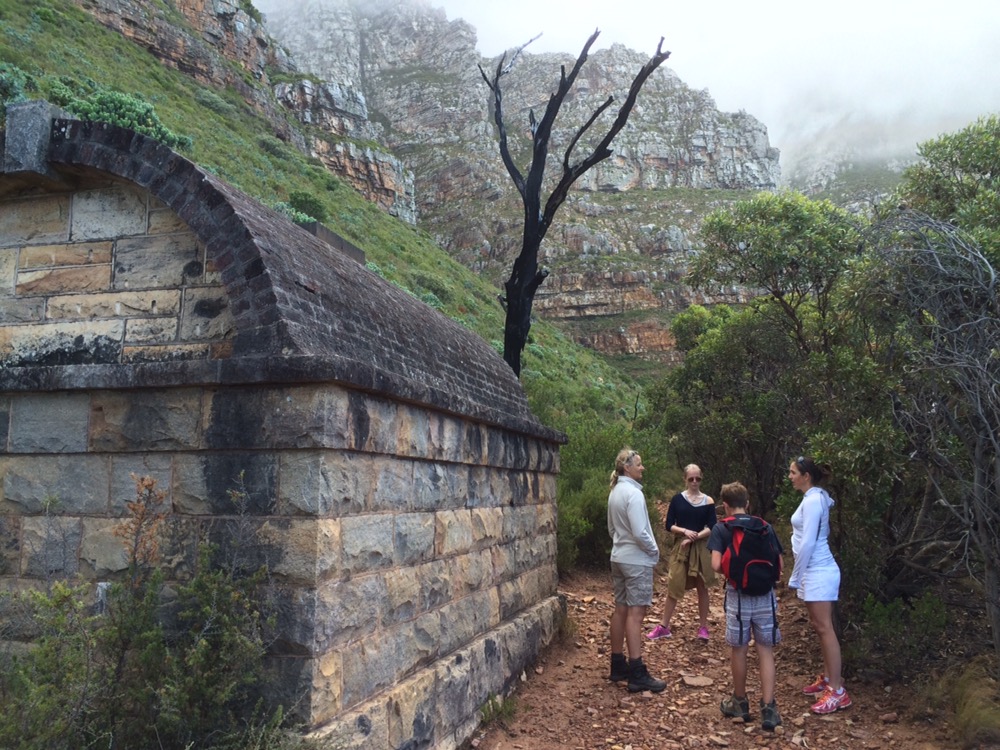 The last thing we needed was a 6:30am start but we did it anyway. Ross arranged for all to meet at the lower cable way station by 8.00 so we got there to find the Somerset West Haupts plus Astri & Liam accompanied by a howling south Easter blowing and the table cloth cascading down the face of the mountain. India Venster climb was therefore judged to be too dangerous and cold so we moved instead to our regular start point on Theresa Ave above Camps Bay. Followed the pipe track which was not in the least stressful, enhanced with jelly babies and jammie dodgers along the way.
