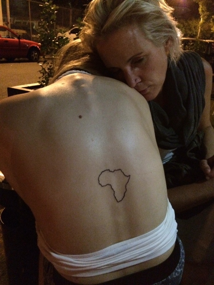 Not long after, the deed was done and Charlie rejoined me sporting an Africa outline on her back. I like it.  Probably will end up looking like Australia in time!