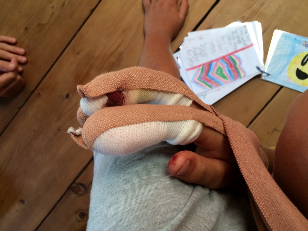 Got the distressing news that my 9 year old grandson Joey had crushed three fingers at school.