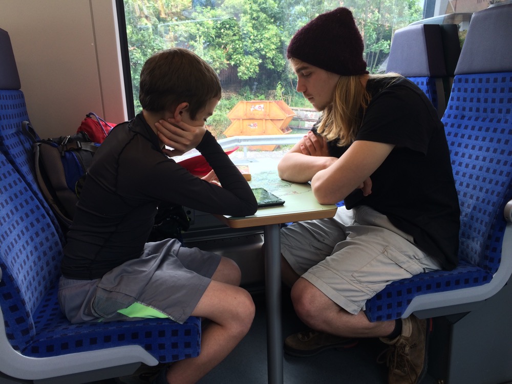 Great train ride thru forest, these trains have no problem climbing hills it seems. The thinkers played chess.